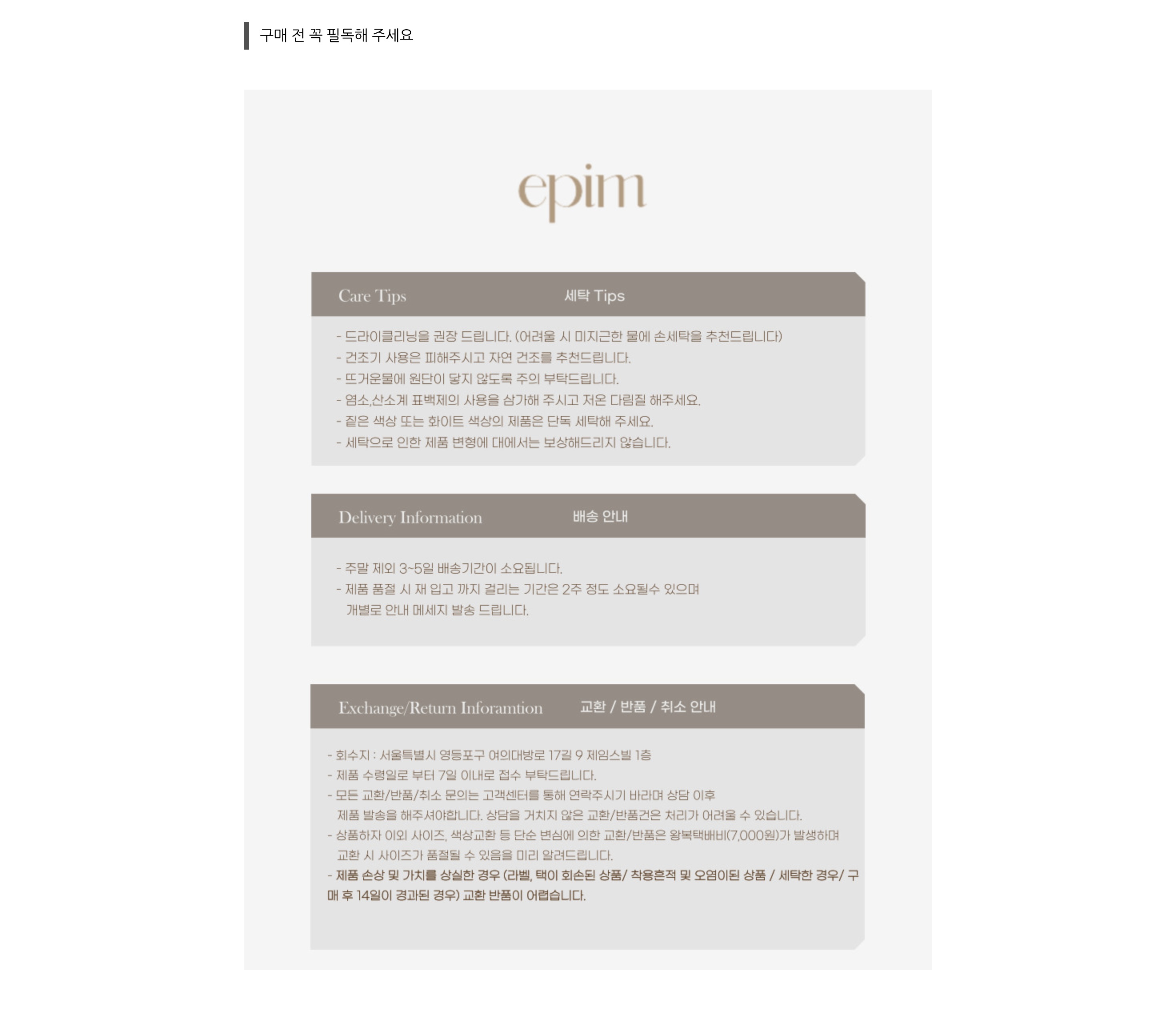 - 고객 변심으로 인한 교환/반품은 상품 수령 후 7일 이내 가능합니다.